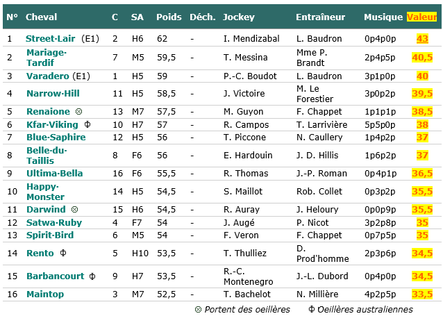 La VALEUR, vous l'avez dans votre journal. Ou encore plus simple dans la colonne de droite quand vous interrogez une course de Plat ou d'Obstacles sur le site http://www.geny.com/reunions-courses-pmu