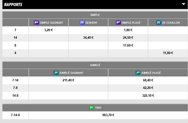 Bien sûr vous toucherez TOUT ! Jumelé Gagnant 211,40 €, Jumelés placés 68,40 €, 42,20 €, 322,10 € Trio 903,70 € ZE4 1504,70 € = Total 3052,50 € Zeturf !